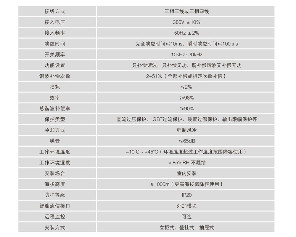 適用于并聯(lián)在含諧波負載的低壓配電系統(tǒng)中,能夠?qū)討B(tài)變化的諧波電流進行快速實時的跟蹤和補償。訂貨范例: