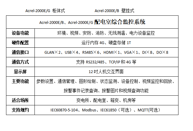 配電室環境監控系統主機Acrel-2000E/B,可實現開關柜運行監控、高壓開關柜帶電顯示、電流電壓等負載運行監測、母線及電纜測溫監測、環境溫濕度監測、有害氣體監測、安防監控,可對燈光、風機、除濕機、空調控制等設備進行聯動控制。實現動力環境各數據的檢測與設備控制,優化動力環境,避免運行環境的失控導致配電設備運行故障,保證維護人員安全,延長設備使用壽命,實現配電動力環境的分布式遠程管理。