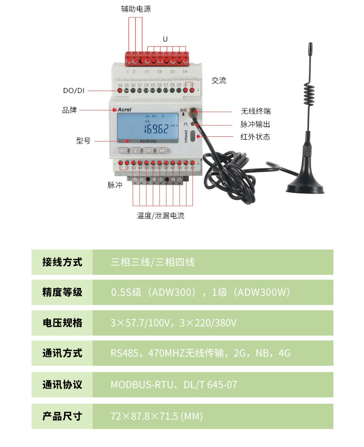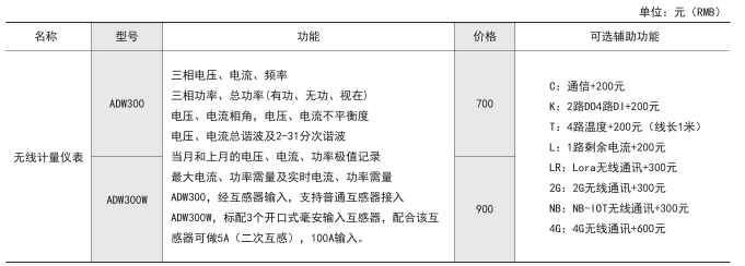 ADW300方便用戶進(jìn)行用電監(jiān)測、集抄和管理,可靈活安裝在配電箱中,可用于電力運(yùn)維、環(huán)保監(jiān)管等在線監(jiān)測類平臺中。訂貨范例: