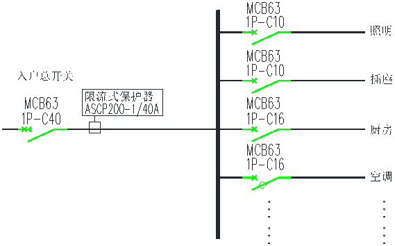 ASCP200-1型電氣防火限流式保護器建議安裝在入戶開關(guān)下端,額定電流值根據(jù)入戶開關(guān)的具體規(guī)格進行設(shè)置,典型應(yīng)用示意圖如圖2所示: