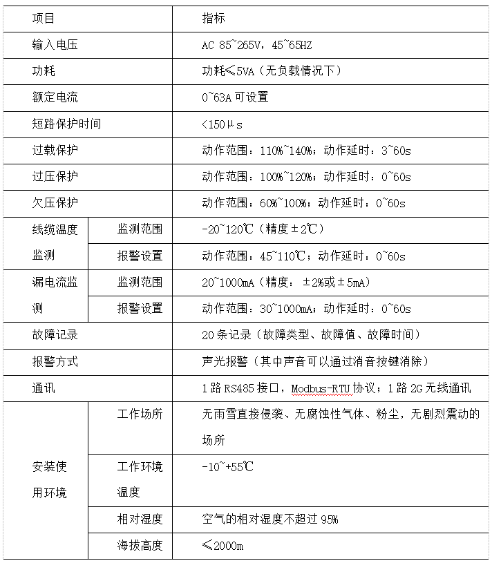 E)電纜溫度監(jiān)測功能,被測線纜溫度超過報警設(shè)定值時,保護器告警或限流保護(可設(shè));