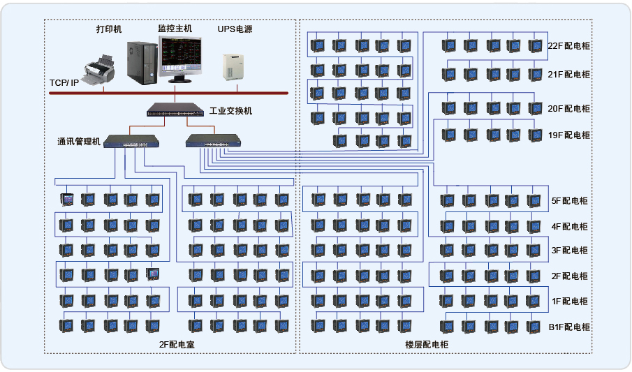 上海百樂門大酒店電力監(jiān)控系統(tǒng)監(jiān)控范圍為百樂門大酒店的22個(gè)樓層的PZ系列電力儀表和配電室的PZ、ACR系列電力儀表進(jìn)行遠(yuǎn)程監(jiān)測(cè)。現(xiàn)場(chǎng)設(shè)備全集中在同一個(gè)配電室中,業(yè)主的電氣值班室就近安排在配電室旁,本系統(tǒng)監(jiān)控中心也安置在該值班室中。系統(tǒng)組網(wǎng)采用常見的3層結(jié)構(gòu),站控管理層、通訊管理層和現(xiàn)場(chǎng)設(shè)備層。