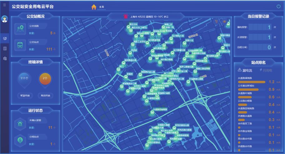 安裝在城市各個公交站臺的安全用電監測終端實時監測公交站運行情況,包括配電漏電流大小、水浸狀態、電能等,管理人員可通過瀏覽器或APP實時掌握運行狀態; 當安全用電監測終端檢測到漏電流超標、水浸等異常情況時,可向管理人員手機APP推送報警信息,即時掌握異常情況