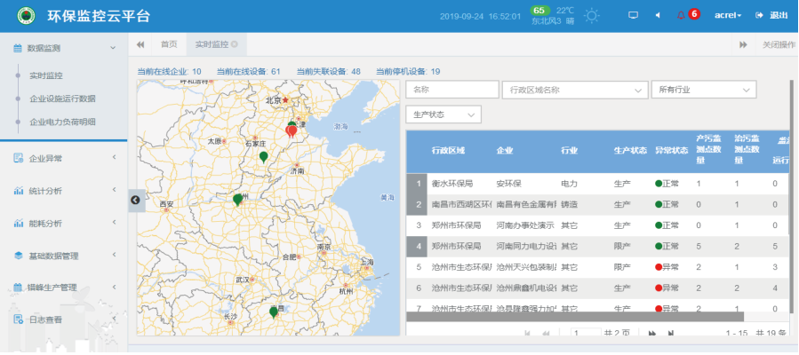 AcrelCloud-3000環保設施用電監管云平臺依托創新的物聯網技術、電力參數傳感技術,實時采集企業污總用電、工藝生產設備用電、污染治理設施設備用電等數據,通過設施運行停車分析、越限分析、停/限產分析、工藝關聯分析等,及時發現環保治理設施、設備等未開啟、空轉、減速、降頻以及異常關閉等未正常工作的情況;同時,通過數據分析,還可以實時監控限產和停產整治企業運行狀態。