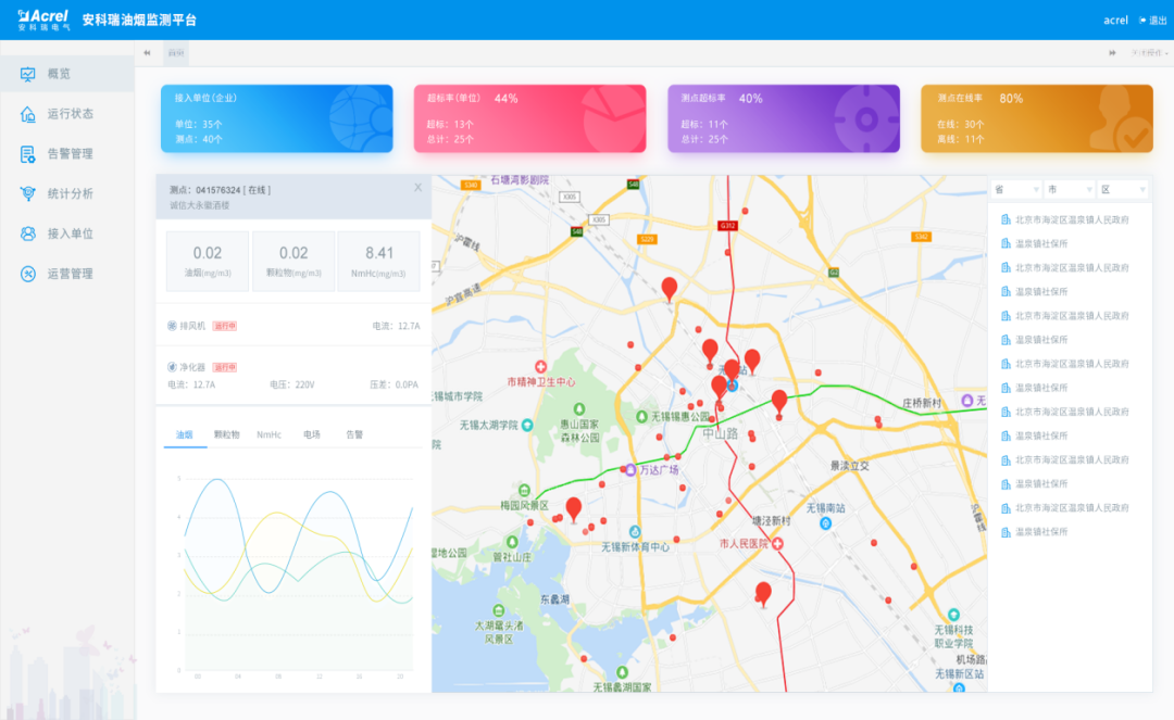 為了彌補現(xiàn)存餐飲行業(yè)在煙油監(jiān)測上的漏洞,同時便利監(jiān)管部門的監(jiān)察,安科瑞油煙監(jiān)測云平臺應(yīng)運而生。油煙監(jiān)測模塊通過2G/4G與云端平臺進行通信和數(shù)據(jù)交互,系統(tǒng)能夠?qū)ζ髽I(yè)餐飲設(shè)備的開機狀態(tài)、運行狀態(tài)進行監(jiān)控;實現(xiàn)開機率監(jiān)測,凈化效率監(jiān)測,設(shè)施停運告警,待清洗告警,異常告警等功能;對采集數(shù)據(jù)進行統(tǒng)計分析、排名等統(tǒng)計功能;較之傳統(tǒng)的靜電監(jiān)測方案,更具安全性和實效性。平臺預(yù)留與其他應(yīng)用系統(tǒng)、設(shè)備交互對接接口,具有很好的擴展性及融合性。