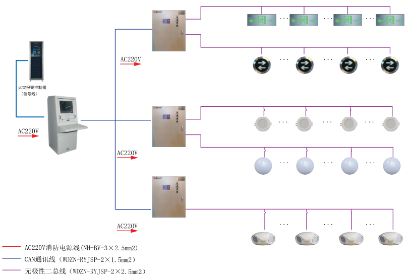 集中電源集中控制型消防應急照明和疏散指示系統采用應急照明控制器(主機)+集中電源+燈具三層結構組網模式,適用范圍廣,滿足各種環境的現場,便于區域化管理,燈具與分配電裝置之間采用二總線通訊,監控器與集中電源之間采用CAN總線通訊,滿足了通訊實時性高的要求。