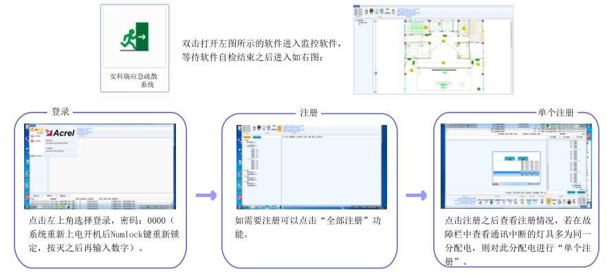 正常情況下本系統與消防火災報警主機通過開關量輸入或RS232通訊方式保持相連,有火災報警情況時,本系統將自動啟動應急狀態(標志燈常亮、照明燈亮起)。若手動模擬啟動應急與復位參考如下操作步驟: