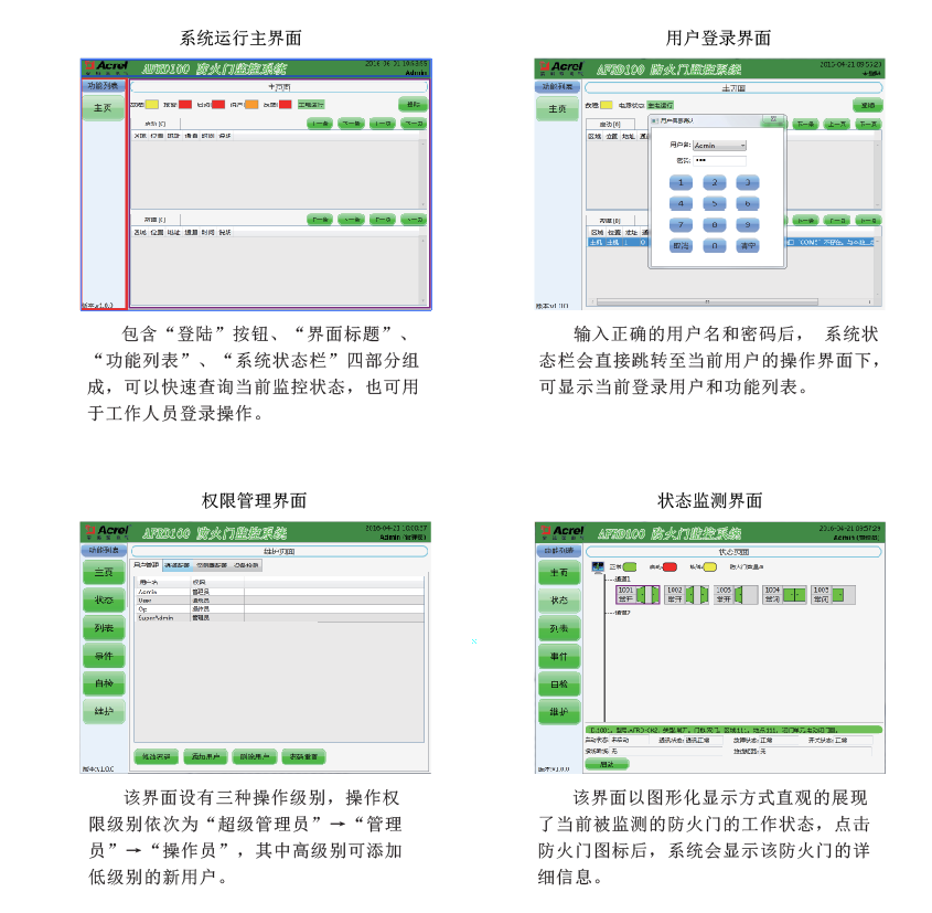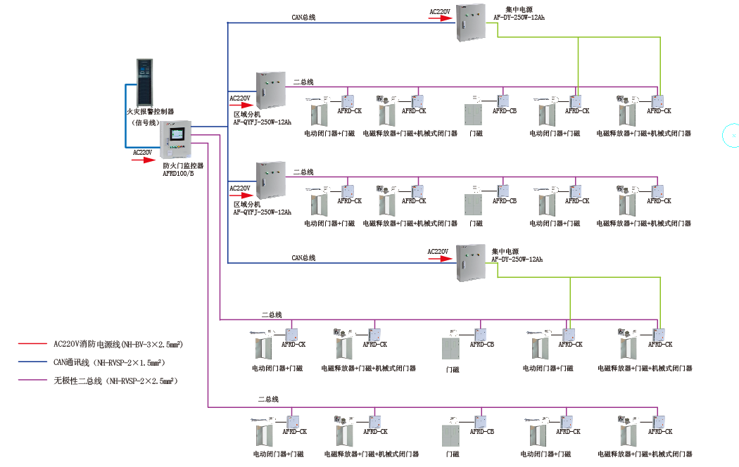 AFRD防火門監(jiān)控系統(tǒng)集中控制其各終端設(shè)備即電動閉門器、電磁釋放器的工作狀態(tài),實時監(jiān)測疏散通道防火門的開啟、關(guān)閉及故障狀態(tài),顯示終端設(shè)備開路、短路等故障信號。系統(tǒng)采用消防二總線將具有通信功能的監(jiān)控模塊相互連接起來,當(dāng)終端設(shè)備發(fā)生短路、斷路等故障時,防火門監(jiān)控器能發(fā)出報警信號,能指示報警部位并保存報警信息,保障了電氣安全的可靠性。