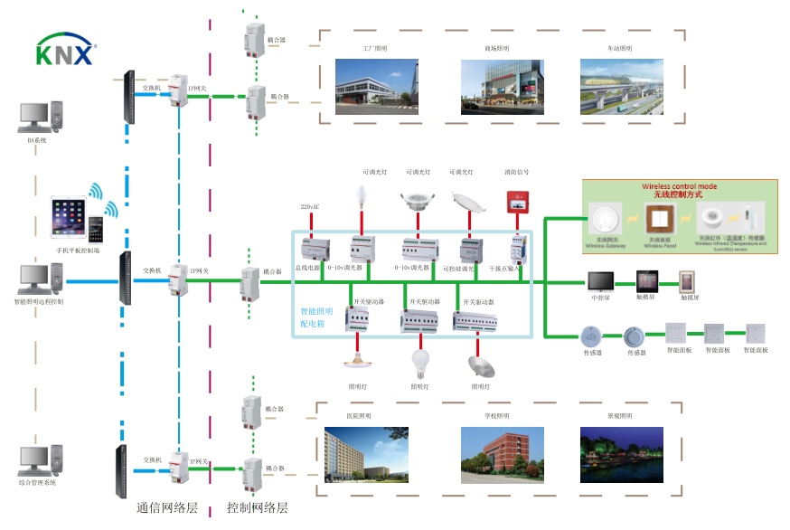 系統通過標準的2*2*0.8EIB BUS總線(即KNX總線)將所有的智能照明控制模塊連接到一起,并組成一套完整的控制系統。該系統理論大連接控制模塊數量達58000多個,在實際項目應用中,系統即可實現照明燈具的遠程集中控制,又可實現就近控制功能。其靈活多樣的智能化控制及龐大的設備容量,特別適用于醫院、學校、酒店及各類體育場所、機場、隧道等大型公建項目照明系統的智能化控制。