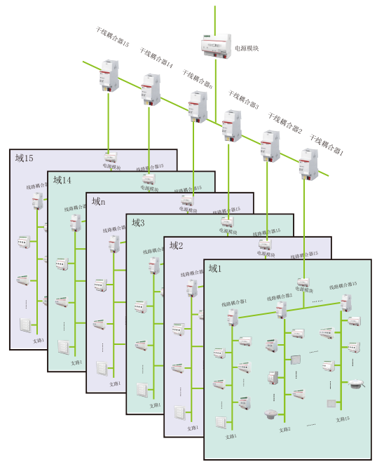 系統一般采用分層結構,搭建項目時,劃分成域和支線這種分布式總線結構,一方面其布局清晰,布線簡單,容量大,對各種類型的項目尤其是大型公建項目特別適用。另一方面有效提高了系統的可靠性。由于每個域和每條支路分別分配了KNX電源,這種電氣的隔離使得系統的某個部分出現故障時,其他部分仍能繼續工作。一條線路或一個域內的數據通信不會影響到其它范圍的數據通信。
