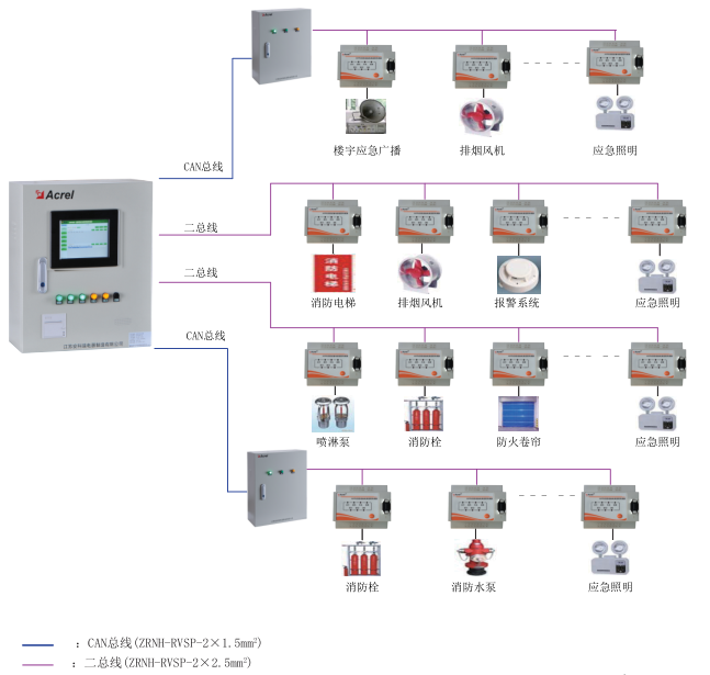 AFPM100消防設備電源監控系統采用AFPM100/B1消防設備電源狀態監控器+區域分機+電壓電流傳感器三層結構組網模式,適用范圍廣,滿足各種環境的現場,便于區域化管理,傳感器與監控器之間采用二總線通訊,監控器與分機之間采用CAN總線通訊,滿足了通訊實時性高的要求。