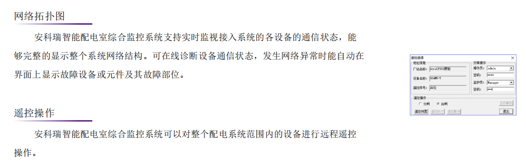 Acrel-2000E配電室綜合監控系統以智能控制為核心,通過物聯網技術的集成應用,實現配電室內環境的全天候狀態監視和智能控制。系統由485通信和以太網通信混合組網,完成站端視頻、環境數據以及安全防范等數據的采集和監控,適配于當下多種應用場景。監控主機也可以作為邊緣計算設備,負責運行邊緣應用和管理接入設備。