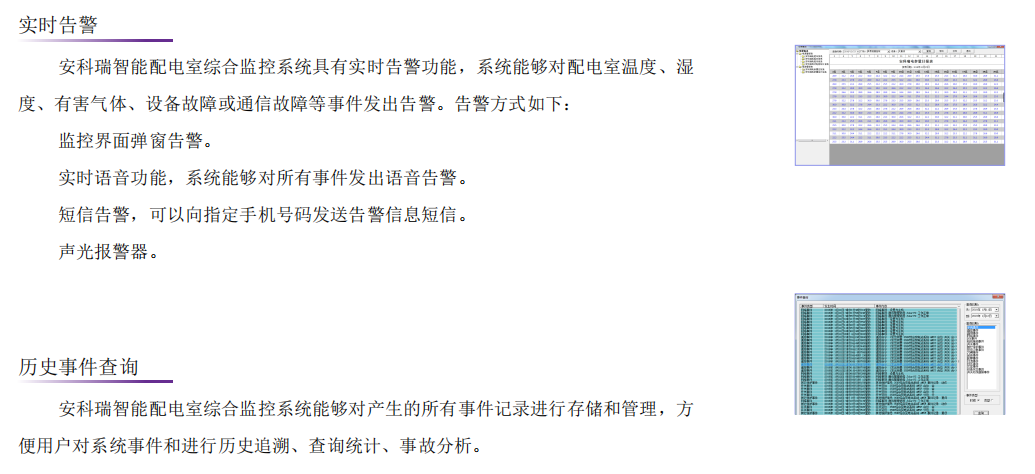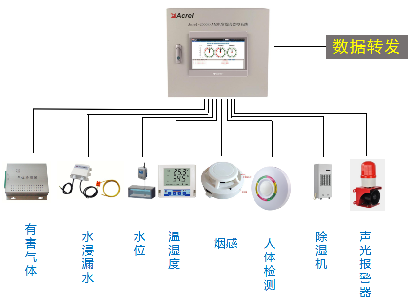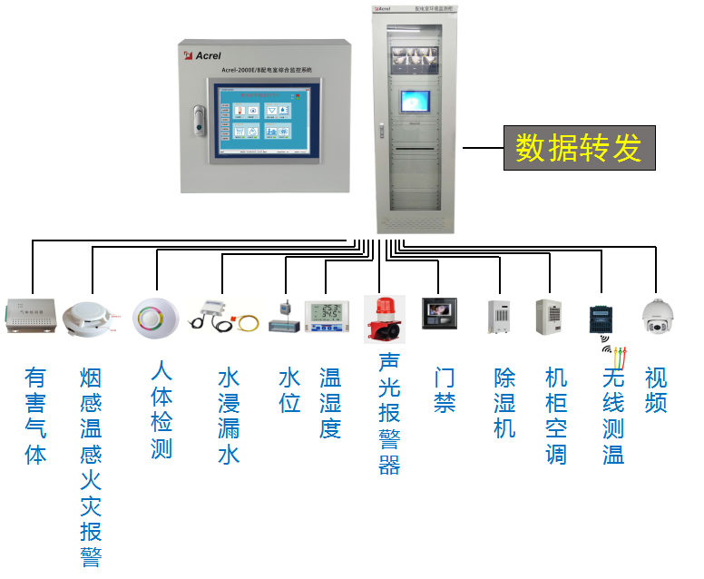 Acrel-2000E配電室綜合監控系統,可實現開關柜運行監控、高壓開關柜帶電顯示、電流電壓等負載運行監測、母線及電纜測溫監測、環境溫濕度監測、有害氣體監測、安防監控,可對燈光、風機、除濕機、空調控制等設備進行聯動控制。實現動力環境各數據的檢測與設備控制,優化動力環境,避免運行環境的失控導致配電設備運行故障,保證維護人員安全,延長設備使用壽命,實現配電動力環境的分布式遠程管理。