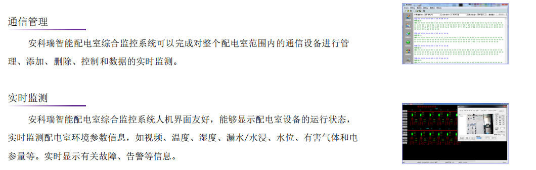 安科瑞電氣股份有限公司根據配電室實際情況,結合多年的變電站和配電室的運行管理經驗,自主研發了Acrel-2000E配電室綜合監控系統系列化產品,通過采集配電室的溫濕度、水浸、煙感、門禁、氣體和視頻等相關數據,及時掌握配電室現場情況,通過可靠的聯動策略實現系統的有機集成,有效解決了視頻監測、環境監測、安全警衛、門禁、消防和智能控制之間的互聯互通,降低了系統的建設成本。