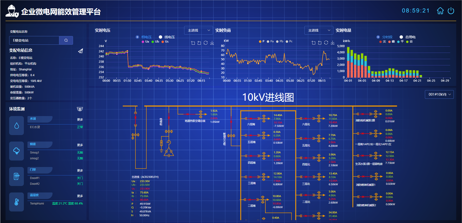 可對(duì)配電系統(tǒng)回路的漏電電流和線纜溫度進(jìn)行實(shí)時(shí)監(jiān)測(cè),實(shí)現(xiàn)安全預(yù)警。 另外還可以接入消防設(shè)備電源監(jiān)控系統(tǒng)、防火門監(jiān)控系統(tǒng)、應(yīng)急照明及疏散指示系統(tǒng)的報(bào)警信息。平臺(tái)可實(shí)時(shí)監(jiān)測(cè)配電系統(tǒng)的諧波畸變、電壓波動(dòng)、閃變和容忍度指標(biāo)分析配電系統(tǒng)的電能質(zhì)量。