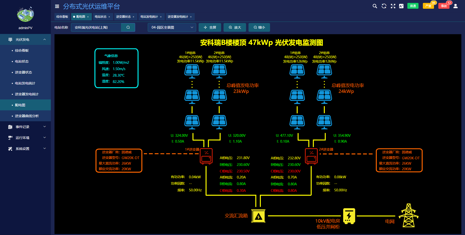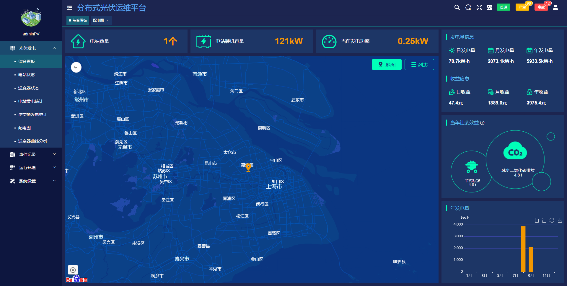 顯示所有光伏電站的數(shù)量,裝機(jī)容量,實(shí)時發(fā)電功率。