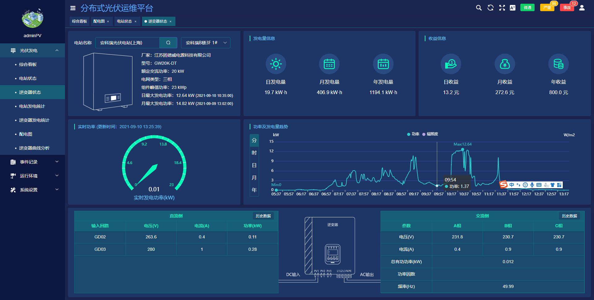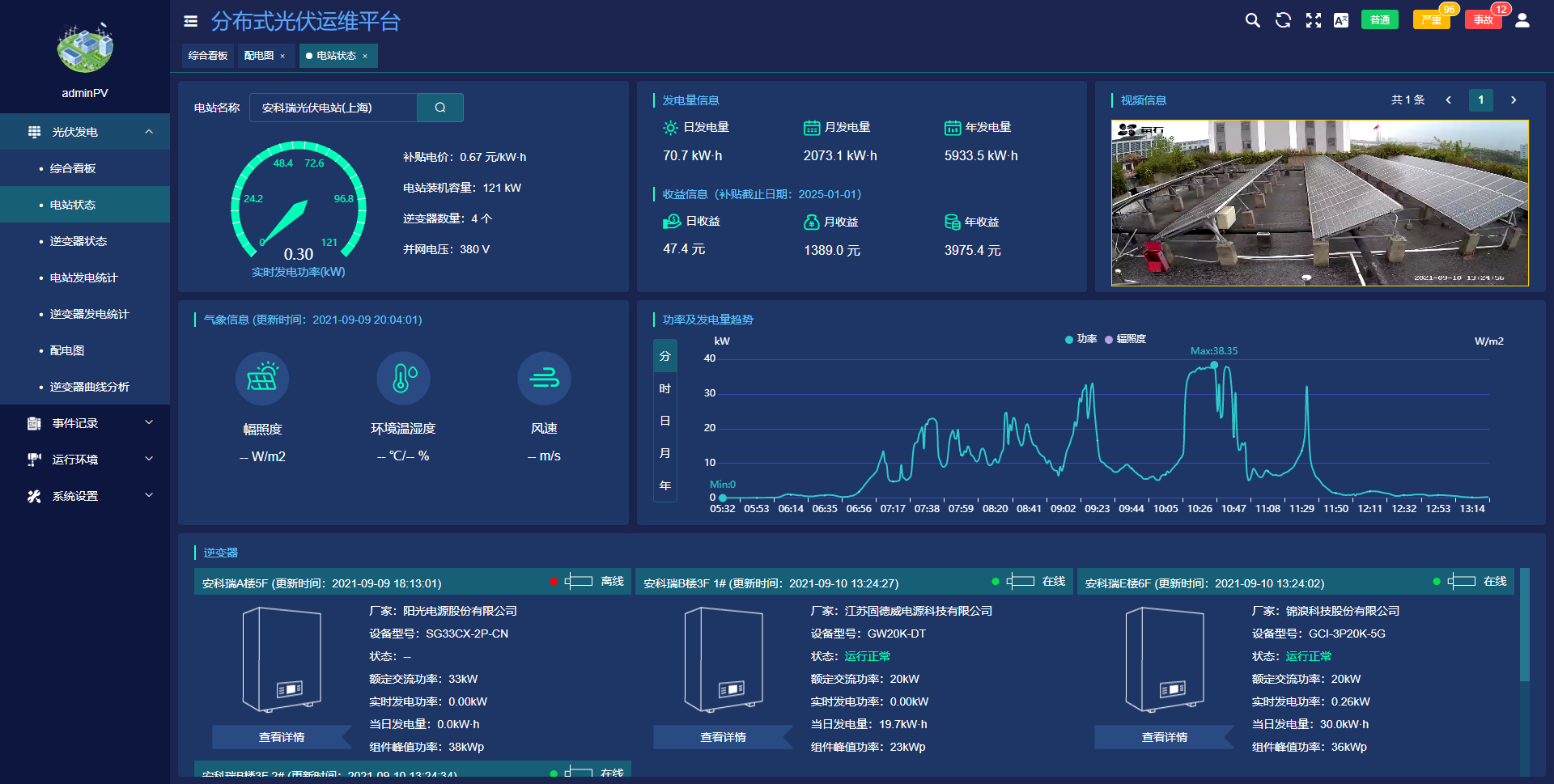 電站狀態(tài)展示當(dāng)前光伏電站發(fā)電功率,補(bǔ)貼電價,峰值功率等基本參數(shù)。
