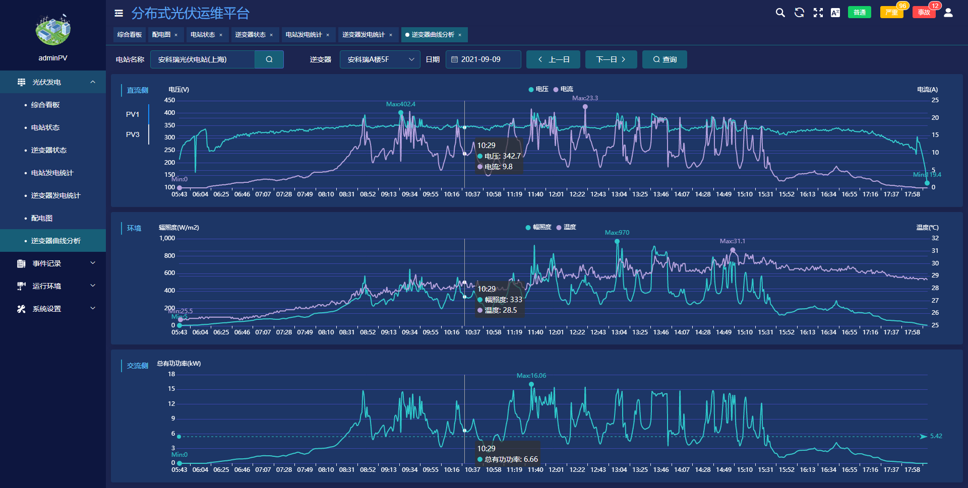 通過曲線圖顯示逆變器功率、環(huán)境輻照度曲線。