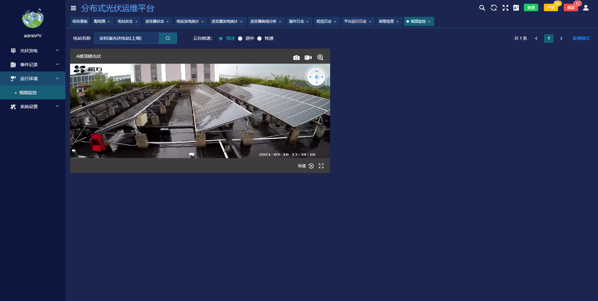 通過安裝在現(xiàn)場的視頻攝像頭,可以實(shí)時監(jiān)視光伏站運(yùn)行情況。對于有硬件條件的攝像頭,還支持錄像回放以及云臺控制功能。如圖所示。
