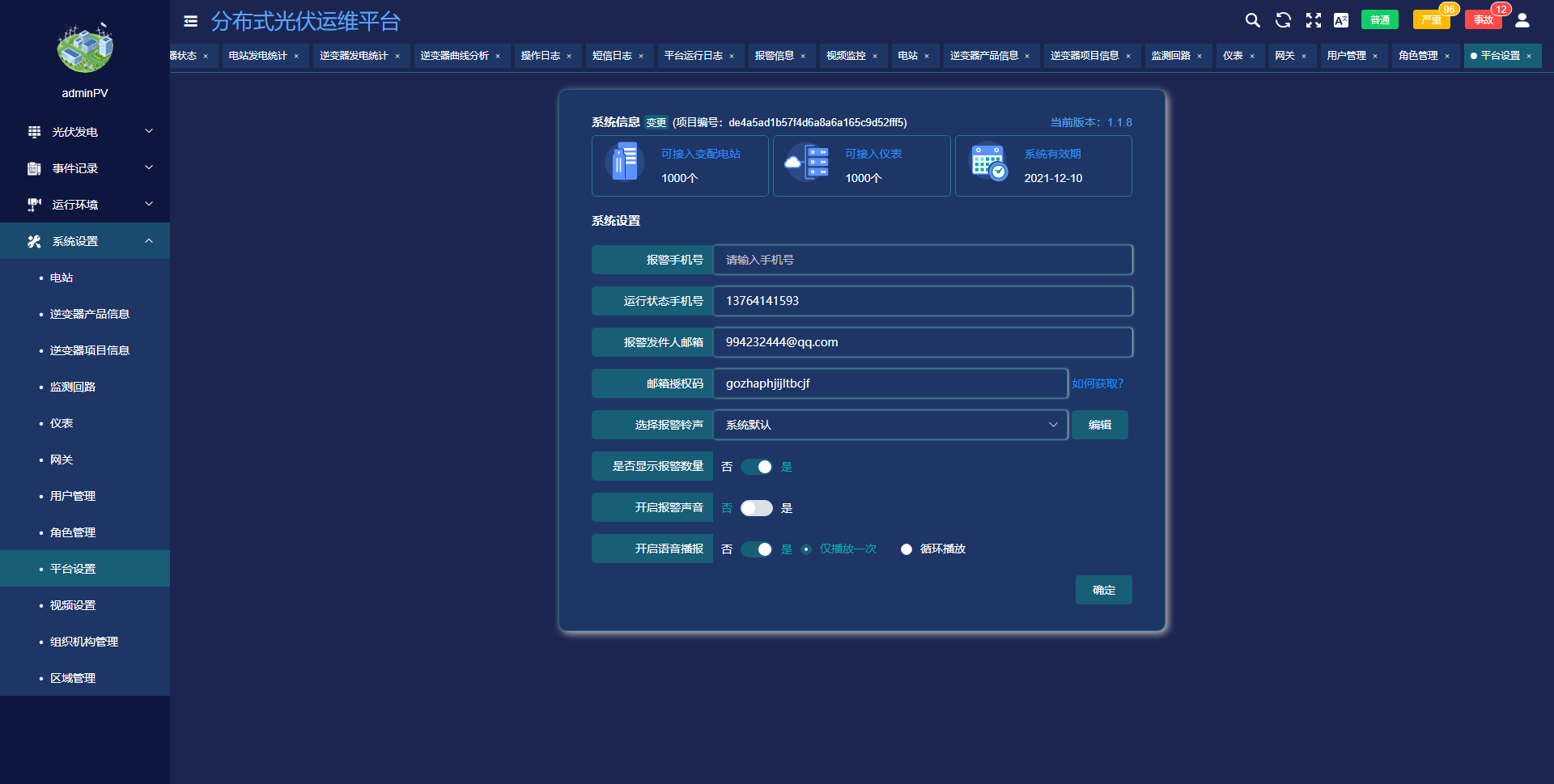 顯示當(dāng)前平臺可接入最大儀表數(shù)量、系統(tǒng)有效期??商顚憟?bào)警管理人郵箱、手機(jī)、報(bào)警鈴聲、報(bào)警參數(shù)等基本信息。如圖所示