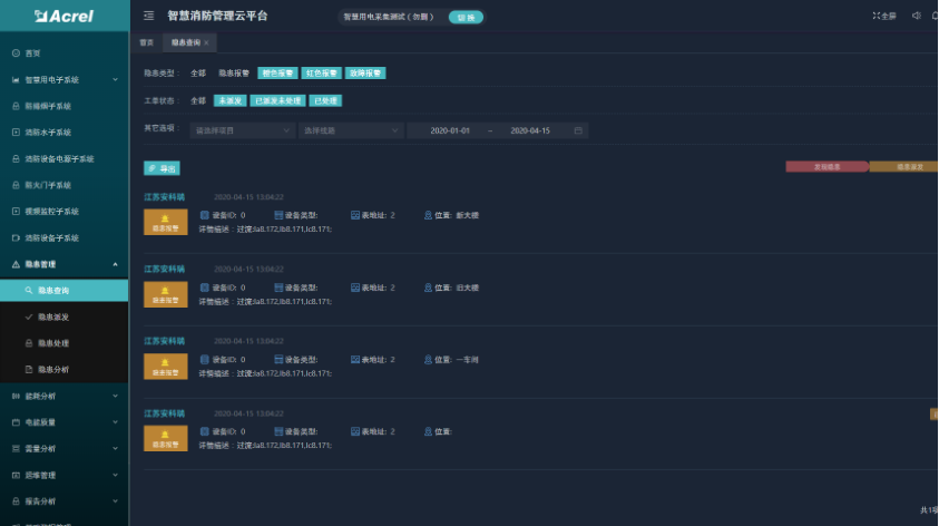 隱患管理功能包括了隱患查詢、隱患派發、隱患處理和隱患分析四個模塊??梢圆榭吹卿浻脩粝碌乃许椖康碾[患信息,并進行派發和處理操作,且對所有隱患進行統計分析。